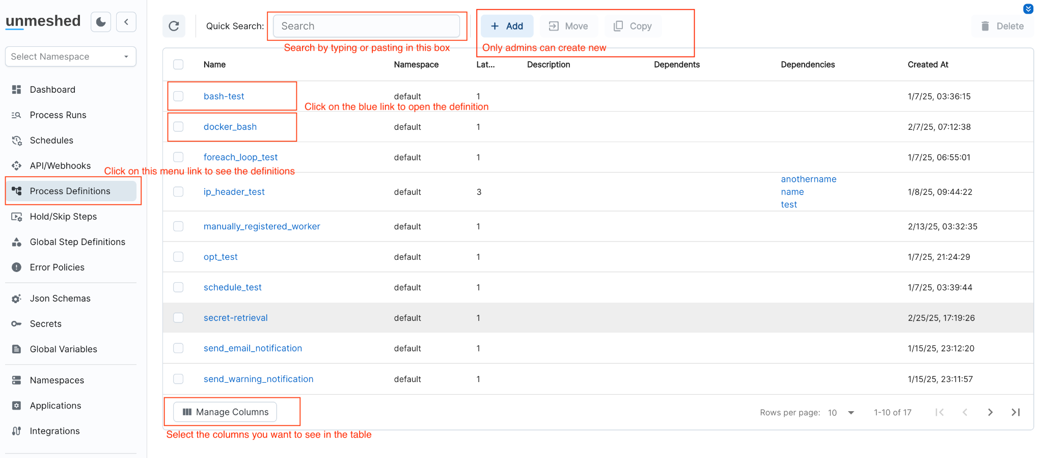 Manage Columnsbutton to select which columns are displayed in the table. - Dependencies & Dependents: Some process definitions show dependencies, which are also clickable for further navigation.